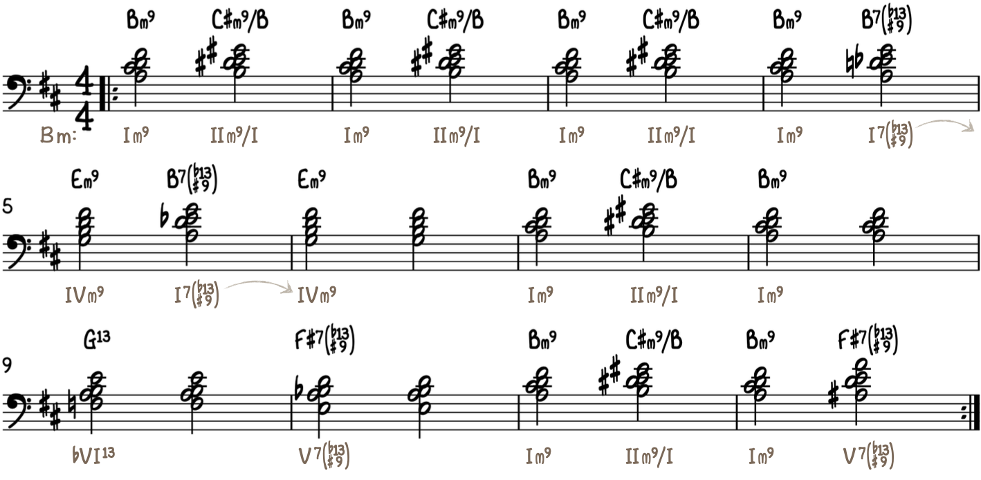 B.B. King’s recording of “The Thrill Is Gone” is in B minor and is an example of a minor blues, a traditional song form in a minor key with a repeating chorus that is twelve bars in length. The basic harmonic structure of a minor blues contains four chords—the Ⅰm7, Ⅳm7, ♭Ⅵ7 and Ⅴ7. In the key of B minor, these chords are Bm7, Em7, G7 and F♯7. Furthermore, there are some common passing chords the many musicians include over this form, such as preceding the Em7 in bar 5 with B7—a harmonic embellishment that we call a secondary dominant. In addition, some players alternate between the Bm7 and C♯m7 in spots where the tonic chord is prolonged throughout the form.
